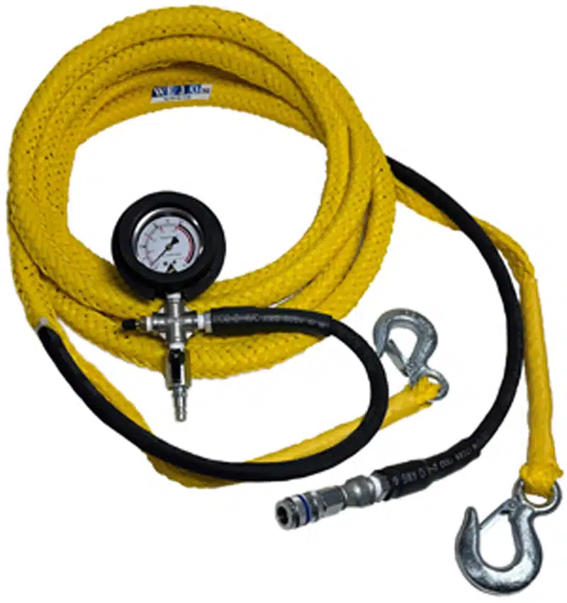 Denna kombinationslina används för att leda in, lyfta och säkert positionera gummiproppar i rörsystem samtidigt som den möjliggör kontrollerad uppblåsning. Tack vare sin inbyggda manometer kan användaren enkelt se att proppen håller rätt tryck – en avgörande faktor för att undvika oönskade rörelser eller tryckrelaterade olyckor. Snabbkopplingar, avluftningsventil och möjlighet till påfyllnad via bildäcksventil gör linan optimal för både installation, service och täthetsprovning i trånga eller svåråtkomliga rör.